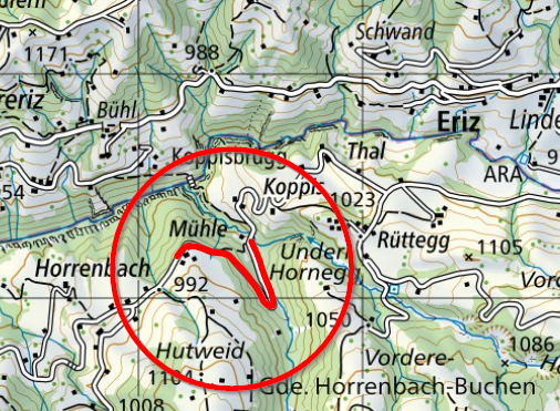 Horrenbach 79b sowie von Seite Eriz bis zur Hutgrabenbrücke ist möglich.